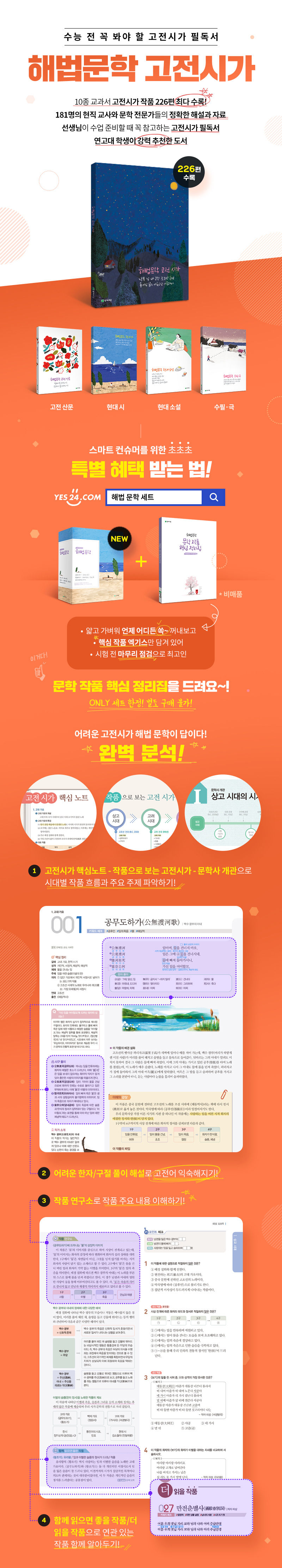 15개정 새 교육과정 10종 문학, 11종 국어 및 독서, 화법과 작문, 언어와 매체 등의 교과서에 수록된 주요 고전 시가 226편을 심도 있게 분석하여 수록했습니다.