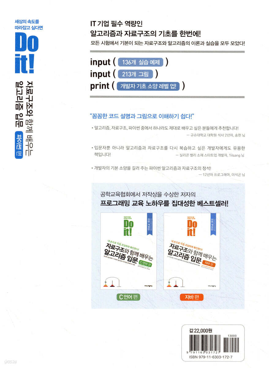 ‘자료구조와 알고리즘’의 기초를 탄탄하게 하고, ‘파이썬’으로 개발 능력을 200% 올리자! ----------------------------------- ‘팩토리얼을 재귀 함수 호출로 구현하세요.’, ‘5분 안에 큐를 구현하세요.’라는 면접 질문 앞에서 얼어 버리는 당신! 머리로는 알겠는데 코드로 표현하지 못한다면? 당신에게는 이 책이 필요합니다! 저자의 친절한 설명과 213개의 그림을 보며 정확하게 개념을 익히세요. 그런 다음에는 136개의 실습 예제를 보며 손으로 코드를 입력하고 프로그램을 실행하여 눈으로 프로그램이 어떻게 동작하는지 확인해 보세요. 눈으로 읽고, 코드를 한 줄씩 입력하다 보면 어느새 자료구조와 알고리즘은 여러분의 것이 됩니다. ----------------------------------- 공학교육협회 저작상 수상, 기초 프로그래밍 교육서의 대가! 시바타 보요 교수의 『Do it! 자료구조와 함께 배우는 알고리즘 입문』 완결판! ----------------------------------- 자료구조와 알고리즘은 프로그래밍 언어의 기초를 공부한 사람들도 어렵게 느끼는 분야입니다. 왜 그럴까요? 그 이유는 알아야 할 내용이 엄청 많기 때문입니다. 그럴 때는 먼저 익혀야 할 핵심 개념을 순서대로 공부해야 합니다. 이 책의 저자는 공학교육협회 저작상을 수상한 프로그래밍 교육서의 대가입니다. 수십 년간 노하우를 축적한 시바타 보요 교수의 설명을 따라가다 보면 어느새 자료구조와 알고리즘의 기초가 탄탄해질 것입니다. ----------------------------------- 코딩 시험에서 ‘파이썬’을 선택하는 응시자가 늘고 있는 이유는? 간결하고 빠르게 작동하는 파이썬으로 각종 알고리즘 시험을 대비하자! ----------------------------------- 요즘 기업에서 코딩 시험을 볼 때 파이썬을 선택하는 응시자가 늘고 있습니다. 파이썬은 다른 프로그래밍 언어보다 코드를 간결하고 빠르게 작성할 수 있기 때문입니다. 이 책은 자료구조와 알고리즘을 구현하는 모든 과정을 파이썬으로 작성하고 그 내용을 자세히 설명합니다. 또한 파이썬의 핵심 개념을 이해하고 코드에 정확하게 적용하는 연습도 충분히 할 수 있습니다. 따라서 이 책은 코딩 시험을 준비하거나 파이썬으로 알고리즘 문제를 해결하고 싶은 사람들에게 명쾌한 해답을 줍니다. 이 책의 모든 과정을 마치고 나면 자신의 프로그램에 적용할 자료구조와 알고리즘을 파이썬으로 직접 작성할 수 있는 실력자가 될 것입니다. ----------------------------------- 213개의 그림과 표로 자료구조와 알고리즘을 더 쉽게 이해한다! ----------------------------------- 코드만 보면 이해하기 어려운 내용도 그림으로 보면 쉽게 이해할 수 있습니다. 이 책은 실습 예제 코드의 핵심 내용을 그림과 표를 이용해 설명했습니다. 코드 속에 매겨 놓은 번호나 기호에 따라 설명과 그림도 순차적으로 표현해서 코드의 실행 순서를 눈으로 확인할 수 있습니다. 그리고 개념을 설명할 때도 그림을 적극 활용해서 이해하기 어렵고 딱딱하기만 했던 자료구조와 알고리즘 개념이 확실하게 자리 잡힐 것입니다. ----------------------------------- 쉽고 친절한 Do it! 시리즈만의 학습 설계가 담겨 있는 16주 완성 진도표 제공! 독학용, 교재용 모두 추천! ----------------------------------- 이 책에서 제공하는 16주 완성 진도표는 ‘자료구조와 알고리즘 수업 강의 계획서’와 비슷하게 구성되어 있습니다. 진도표의 ‘완료 날짜’를 채워 가며 대학에서 강의를 듣는 기분으로 공부해 보세요. 반드시 공부해야 하는 기초 개념은 진도표에 말풍선으로 표시했습니다. 이 책에서 알려 주는 16주 과정을 잘 따라가면 막연히 어렵게만 느껴졌던 자료구조와 알고리즘 과목이 부담스럽지 않을 것입니다. ----------------------------------- 배우고, 나누고, 함께 성장하는 두잇 스터디룸에서 공부해 보세요 ----------------------------------- 혼자 계획을 세우고 공부하다 보면 금방 지치기 마련입니다. 그럴 땐 나와 비슷한 고민을 하는 독자를 만나 어려운 내용을 공유해 보면 어떨까요? 내가 열심히 공부한 내용으로 다른 사람을 도와줄 수 있다면 더 보람되고 뿌듯할 것입니다. 같이 공부하는 친구를 두잇 스터디룸에서 만나 학습 성취도를 높여 보세요! * 두잇 스터디룸: cafe.naver.com/doitstudyroom ※ 이 책의 전체 실습 파일은 이지스퍼블리싱 홈페이지 자료실에서 내려받을 수 있습니다. - 이지스퍼블리싱 홈페이지: www.easyspub.co.kr/Main/PUB ▶ [자료실]을 클릭한 후 도서명으로 검색하세요. ★ 이 책의 대상 독자 · 파이썬을 알고 사용해 본 경험은 있지만 자료구조와 알고리즘에는 익숙하지 않는 사람 · 알고리즘 기초 소양은 있지만 파이썬으로 구현하는 방법을 알고 싶은 개발자 · 알고리즘 경진 대회나 IT 기업의 코딩 시험을 준비하는 취준생 · 대학에서 알고리즘 과목을 A+ 받고 싶은 대학생 ★ 이 책의 주요 특징 · 자료구조와 알고리즘의 핵심 이론과 개념을 213개의 그림으로 쉽고 친절하게 설명한다. · 이론을 배웠으면 다음에는 실습이 필수! 136개의 [Do it! 실습]으로 코드를 내 것으로 만들자! · 파이썬의 개념과 코드 분석은 덤! [보충 수업]과 [조금만 더!] 코너에서 파이썬을 정복하자! |