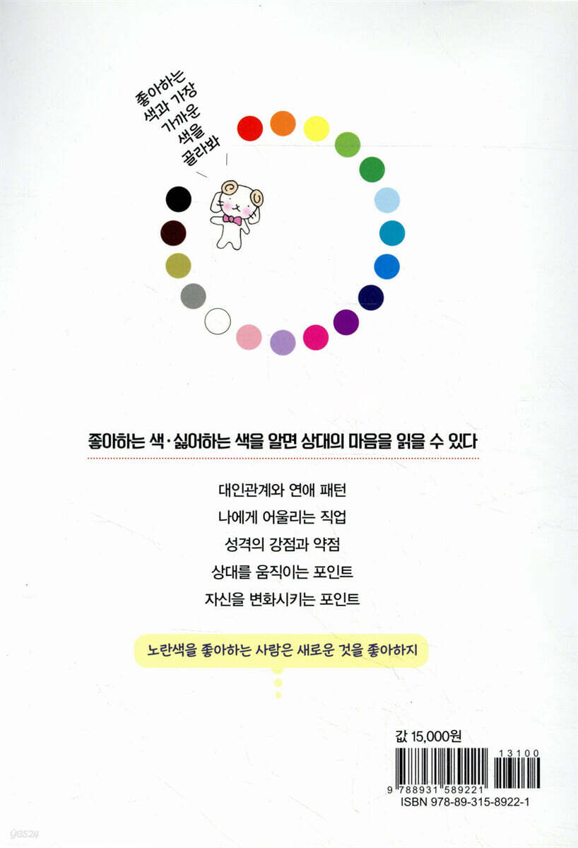 불가사의한 색의 힘 ① 역사에 숨겨진 색의 비밀 불가사의한 색의 힘 ② 색은 사람의 감각을 변질시킨다 불가사의한 색의 힘 ③ 모르면 손해보는 색과 돈의 관계 불가사의한 색의 힘 ④ 살이 빠진다? 잠이 온다? 신체에 영향을 주는 색 불가사의한 색의 힘 ⑤ 성격을 바꾸고 인생까지 바꾼다 색에 관한 이런저런 이야기 1장 색의 취향과 성격의 관계 색은 성격을 비추는 거울 색형(色型)인간과 형형(形型) 인간 테스트 색형 인간과 형형 인간의 성격 성격이란 무엇일까? 색의 취향과 성격 진단 진단 보는 법 빨간색을 좋아하는 사람의 성격 분홍색을 좋아하는 사람의 성격 주황색을 좋아하는 사람의 성격 노란색을 좋아하는 사람의 성격 연두색을 좋아하는 사람의 성격 녹색을 좋아하는 사람의 성격 청록색을 좋아하는 사람의 성격 파란색을 좋아하는 사람의 성격 사람을 움직이는 색채 심리술 상대가 ‘No’라고 말하지 못하는 블랙 헤일로 효과 심리를 움직이는 오렌지 셰이크핸드 효과 상대의 마음을 열다 ① 컬러 미러링 효과 상대의 마음을 열다 ② 핑크 디스클로저 효과 주도권을 잡는 레드 임프레션 효과 상대의 마음을 이완시키는 런천 테크닉 회의에서 의견을 통과시키는 파이브 레드 효과 화난 상대를 진정시키는 블루 앵거 컨트롤 상대를 사랑에 빠지게 하는 컬러 임프레션 효과 Column 넥타이의 색과 모양으로 보는 성격 2장 사람을 간파하고 움직이는 심리학 색의 힘으로 사람의 성격을 간파하다 색으로 사람을 간파하는 방법 ① 질문에 대한 반응에서 해석한다 색으로 사람을 간파하는 방법 ② 질문 방법을 궁리하고 해석한다 색으로 사람을 간파하는 방법 ③ 싫어하는 색을 질문하고 해석한다 색으로 사람을 간파하는 방법 ④ 선호하는 옷 색상에서 해석한다 색으로 사람을 간파하는 방법 ⑤ 수수한 옷 화려한 옷, 두 가지 선택에서 해석한다 색으로 사람을 간파하는 방법 ⑥ 검은색 옷과 흰색 옷, 두 가지 선택에서 해석한다 색으로 사람을 간파하는 방법 ⑦ 코디네이트에서 해석한다 색으로 사람을 간파하는 방법 ⑧ 상의의 색에서 해석한다 색으로 사람을 간파하는 방법 ⑨ 신발 색에서 해석한다 색으로 사람을 간파하는 방법 ⑩ 스마트폰 케이스에서 해석한다 색으로 사람을 간파하는 방법 총정리 색을 통해 사람의 성격을 해석한다 사람을 움직이는 색채 심리술 상대가 ‘No’라고 말하지 못하는 블랙 헤일로 효과 심리를 움직이는 오렌지 셰이크핸드 효과 상대의 마음을 열다 ① 컬러 미러링 효과 상대의 마음을 열다 ② 핑크 디스클로저 효과 주도권을 잡는 레드 임프레션 효과 상대의 마음을 이완시키는 런천 테크닉. 회의에서 의견을 통과시키는 파이브 레드 효과 화난 상대를 진정시키는 블루 앵거 컨트롤 상대를 사랑에 빠지게 하는 컬러 임프레션 효과 Column 넥타이의 색과 모양으로 보는 성격 3장 색의 힘으로 자신을 변화시킨다 색의 힘으로 성격을 바꿀 수 있다 성격도 변하고 색의 취향도 변한다 자신감을 갖고 싶을 때 초조해하지 않는 성격을 바랄 때 거짓말을 하지 않는 성격이 되고 싶을 때 상냥한 성격이 되고 싶을 때 긴장하지 않는 성격이 되고 싶을 때 적극적인 성격이 되고 싶을 때 끈기 있는 성격이 되고 싶을 때 동경하는 미인이 되고 싶을 때 계속 운이 좋기를 바랄 때 좋아하는 색상별 파워 업 포인트 |