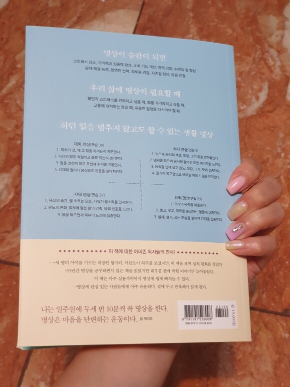 마음 복잡한 요즘 마음돌보는 연습하기. 내마음 달래주는 명상습관 갖기에 도움되는 책인것 같아 가볍게 읽기위해 구매했어요. 명상하면 눈감고 아무생각 안하는건줄 알았는데 호흡,휴식,멘탈까지 아우러 관리하는 습관이라 정신이 건강해 질수 밖에 없는 방법들이 잘 정리되어 있다. 하루 10분 투자로 내 삶이 건강하게 바뀌는 걸 몸소 느낄수 있다면 감사한 일 이다. 오랜만에 맘편히 가볍게 읽기 좋은 책을 만난것 같아 읽는것만으로도 행복해진다. 명상시작전부터 읽기시작할 때 부터 건강한 멘탈이 될 준비가 되는것 같다.