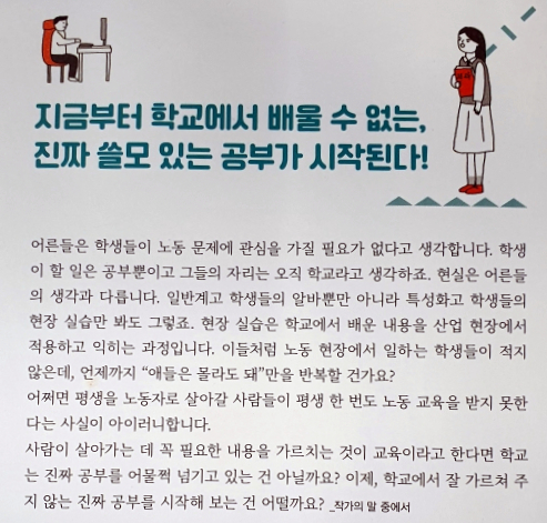다음에는 차례차례 주제별로 책이 한 권씩 따로 나오면 정말 좋을 것 같다. 예를 들면, 실제 알바 노동자들이 겪은 사례를 중심으로 노동 계약서 쓰기, 주휴 수당 요구, 휴일이나 휴가 요구 등을 펴내는 책이 있으면 정말 좋겠다. 노동은 우리 인생의 이야기다. 그 속에서 노동자의 권리를 지켜내는 일이 어떤 것인지도 알 수 있다면 좋을 것 같다. <학교에서 가르쳐 주지 않는 노동 이야기>를 시작으로 노동에 대한 이야기를 하는 책들이 다양해지고 많아지기를 기대해 본다.