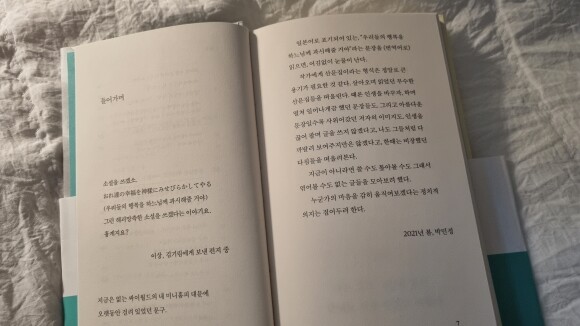 작가는 작가로서의 자신의 인생, 그리고 책을 읽거나 지인과 대화를 나누며 느낀 소회를 풀어놓는다. 주변을 알아가면서도 이것이 결국 본인 소설의 소재가 됐을 때 허락을 받았음에도 불구하고 드는 죄책감에 대해 논할 때는 문득 작년 어떤 문학상의 사건이 떠올랐다. 허락을 받아서 시작했지만 변용된 부분에서 이것이 타인에 대한 작가의 평가처럼 보일까 두려워하는 작가의 모습에서 '소설가로서의 윤리 의식'에 대한 작가의 생각을 엿볼 수 있었다.