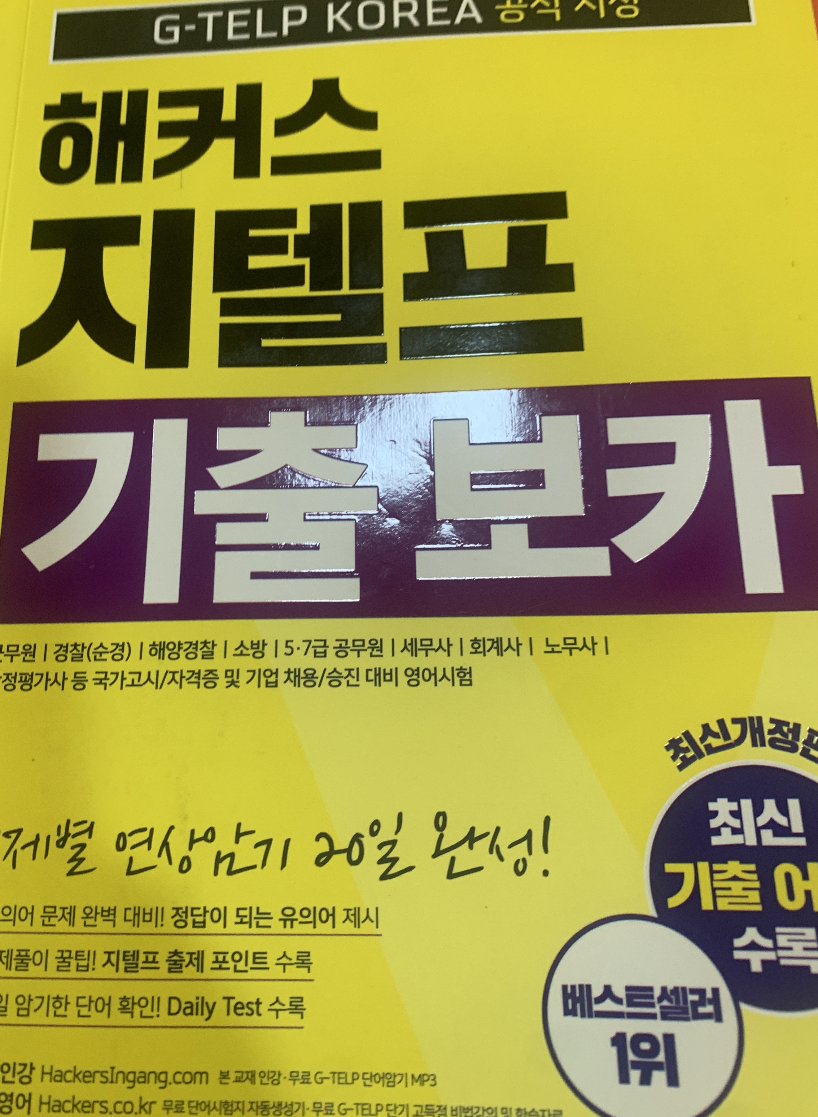 지텔프 준비하면서 제일 먼저구매한게 단어장입니다. 어학시험에서 기본이니까 고민도 많이 했습니다. 서점에서 한번씩 다 살펴보고 실제 지텔프 65점 달성하신분들 후기 읽어봐도 가장 인기있는게 해커스라서 구매했는데 역시 믿고보는 해커스 추천합니다. 편집도 깔끔하고 지원서비스도 좋아서 감사합니다.
