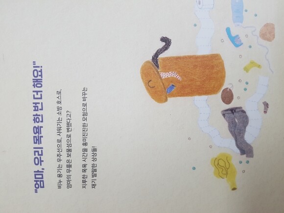 "우리 아기, 목욕할 시간이란다. 이제 들어오렴." "엄마, 나는 물에 들어가면 안 돼요. 나는 외계인이거든요."