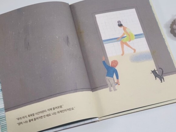 목욕을 준비하는 엄마와 목욕을 하고 싶지 않은 아이는 벽으로 나뉘어 있다. 아이는 벽 넘어 목욕탕으로 들어가게 될까? 얼굴이 보이지 않는 두 사람의 모습은 표정을 상상하게 한다.
