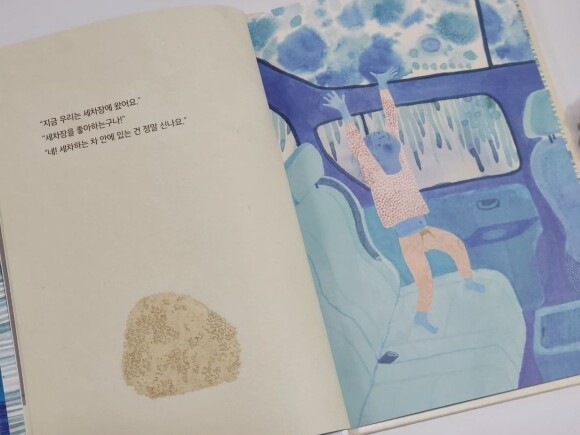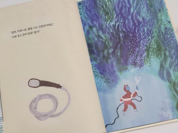 표지부터 푸른 색감이 마음을 사로잡았다. 보기만 해도 시원해지는 느낌이다. 여름을 지나 가을로 다가가는 길목이지만 표지의 청량감은 더할 나위 없이 좋다. 목욕을 하기 싫어하는 아이는 자신이 외계인이라서 물에 들어갈 수 없다고 말한다. 아이의 엉뚱한 말에도 어머니는 다정하게 답해주셨고, 어머니의 호응에 힘입어 아이는 여러 목욕 용품을 보고 상상의 나래를 펼친다. 목욕을 하는 과정에서 욕조는 우주, 불길 속, 세차장, 바다, 동굴 등 다양한 장소로 변모한다. 별 거 아닌 일상적인 용품들을 가지고 재미있게 노는 아이의 모습에 살포시 웃음 지었다. 씻기 싫어하는 아이를 바꿀 수 있는 것은 부모의 말 한마디와 적절한 장난감인 것 같다. 물에 들어갈 수 없다는 아이를 면박주거나 윽박질렀으면, 목욕 시간은 전쟁이 되지 않았을까. 주변의 아이를 키우시는 분들께 일상은 전쟁의 연속이라는 말을 듣고는 한다. 요즘들어 결혼 생각이 들곤 하는데, 그림책 속 어머니처럼 아이에게 다정하게 호응해주는 부모가 되어 행복한 가정을 꾸리고 싶다.