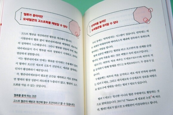 “노화, 자외선, 활성 산소로 인해 고스트화된 혈관에는 혈액이 흐르지 않는다. 그 결과 37조 개의 세포에 산소, 영양소, 호르몬 정보의 공급이 끊기고, 몸속 기관들은 동시다발적으로 고장 나기 시작한다. 우리는 이러한 현상을 ‘노화와 질병’으로 마주하게 된다.” 살이 쉽게 찐다. 탈모가 심해진다. 피부 문제가 많아졌다. 손발톱이 잘 깨진다. 발뒤꿈치 각질이 일어난다. 계단을 오르기 힘들다. 쉽게 피로하고 집중력이 떨어졌다. 쉽게 잠들지 못한다. 눈이 건조하다. 이명이 들린다. 손발이 차다. 운동 후 근육통이 오래간다. 의욕이 없다. 상처가 잘 아물지 않는다. 위의 것들은 건강 상태를 검사하는 것이 아니라, 실질적으로 몸에 이상이 생겼다는 신호를 우리 몸이 보내오는 것이라고 한다. 즉, 복합적인 문제가 아니라 다들 개별적으로 발생하는 몸의 이상인 것이다. 우리의 몸에는 수많은 혈관이 손끝, 발끝, 머리카락 끝까지 영양분을 공급하는데 그 길에 문제가 생기면 발생하는 것들이다. 심장으로 흐르는 혈액이 멈추면 심장병, 뇌로 흐르는 혈관에 문제가 생기면 뇌출혈 등 해당 부위에 혈관 문제가 생기면 질환이 발생하는 것이다.