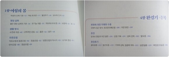 2장 신체기관 : 병원에서 가장 자주 치료하는 질병에 관한 내용, 3장, 4장 임신, 출산, 완경(폐경)을 다룬다. 5장 건강하게 사는 법 : 여성이 살아가며 맞닥뜨리는 수많은 건강 문제는 몸에 좋지 않는 식습관, 운동부족, 스트레스 나쁜 생활 습관으로 인한 호르몬 불균형과 신체기관의 기능 부진에 원인이 있다. 체중관리, 노화를 늦추는 법, 면역력을 키우는 법을 알아보자