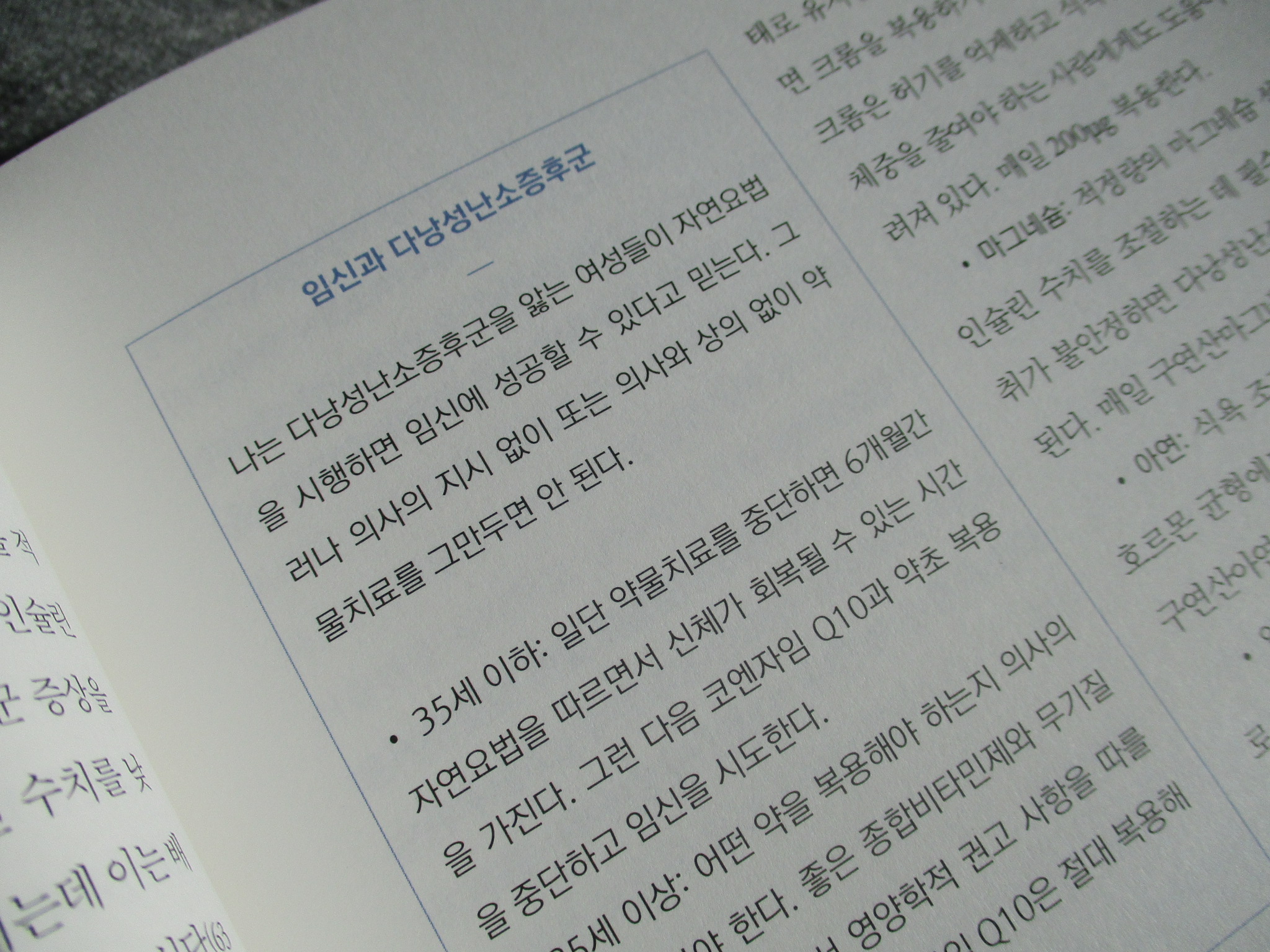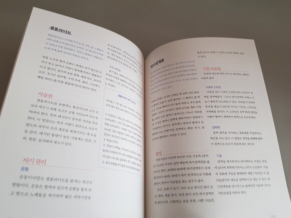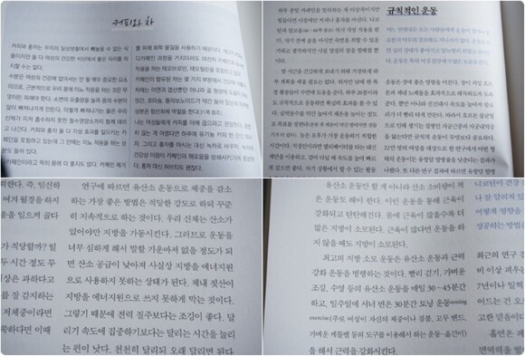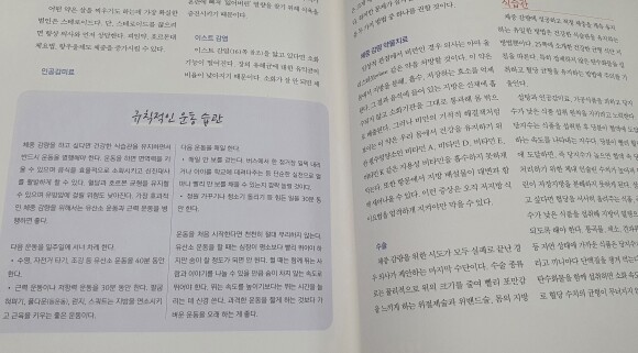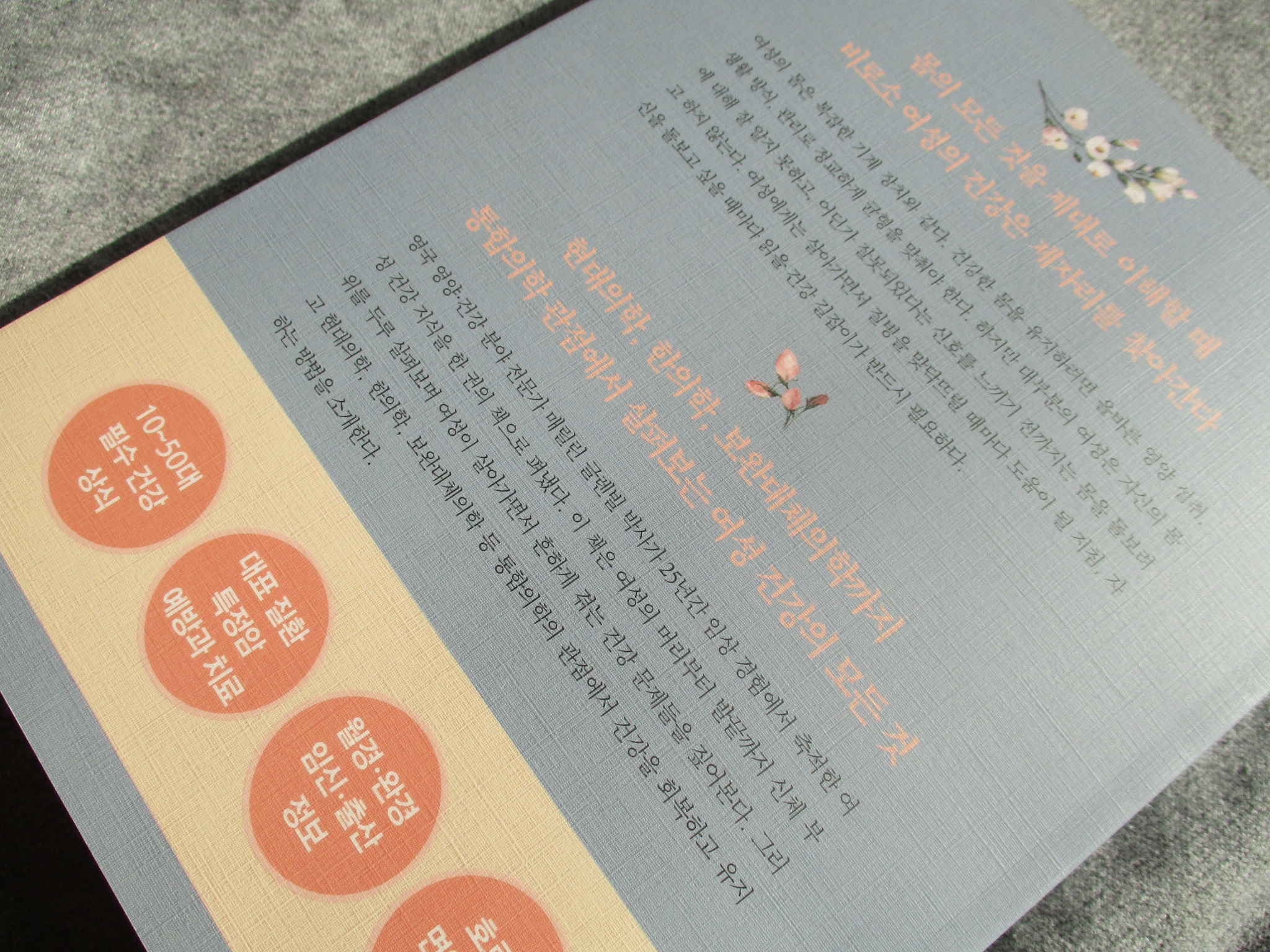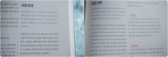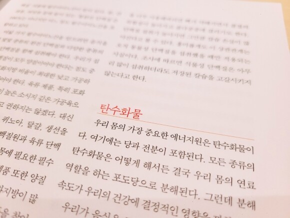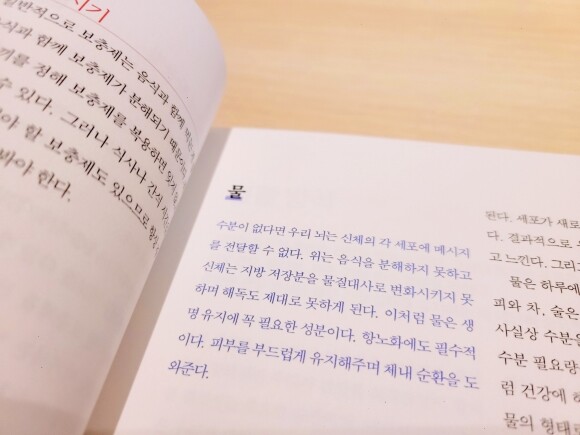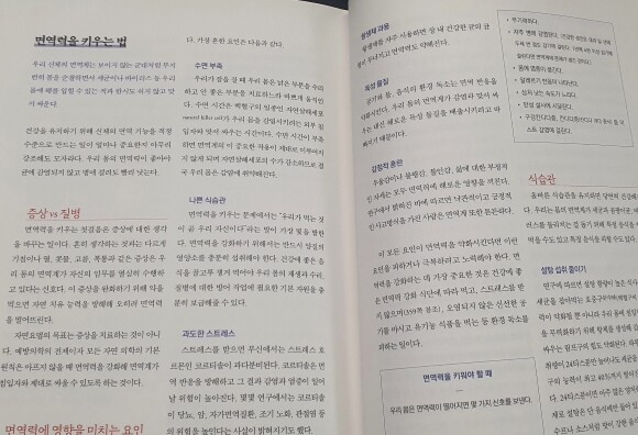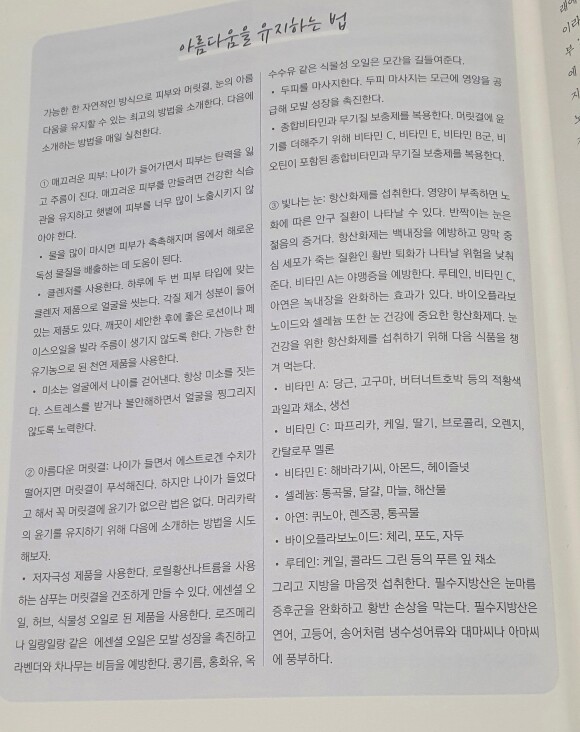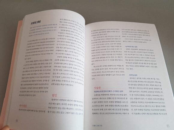 바이블이라는 책제목처럼.. 여성 건강바이블은 총 400장에 육박할만큼 아주 도톰한 두께감을 자랑하는데요.. 책의 글자가... 내 나이를 몇개 빼고 싶을만큼... 아주 작아서 읽기가 고역이였지만.. 종이자체가 도톰한 재질이라서.. 질적으로 감탄하면서 읽었답니다.^^ (원래 이렇게 작은 글꼴은.. 비추하는데.. 한장한장의 도톰한이 마음에 들어서 책내용 들어가기 앞서 칭찬 한줄부터^^)