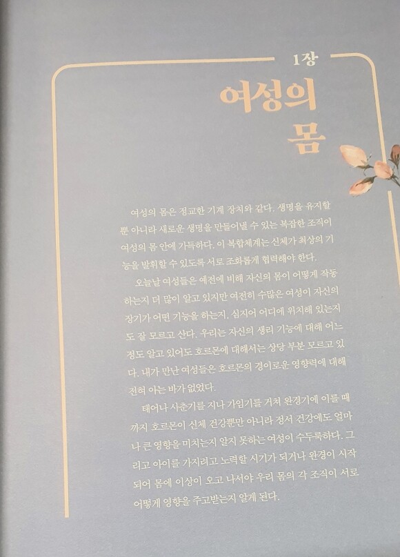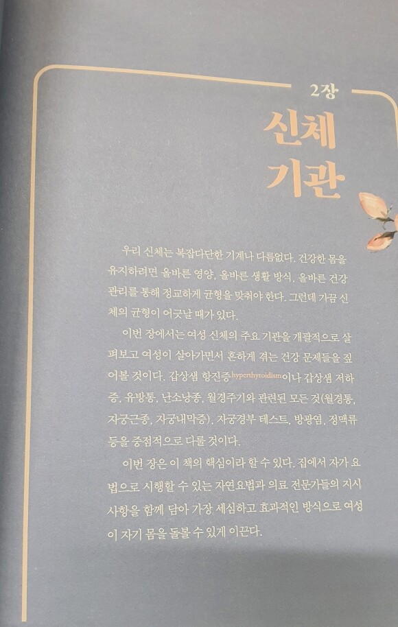 처음에는 너무 딱딱한 전문용어들이 있어서 어렵지 않을까 생각했습니다. 그러나 몸의 각 기관과 다양한 성분과 용어들은 전문적인 단어들이지만 그에 설명되는 이야기와 내용은 이해하기 쉽게 풀이해놓았습니다. 1장에서는 우리의 신체기관이 어떻게 연계돼 있는지 설명합니다. 현대의학과 자연요법을 같이 설명해놓아서 다양한 효과를 알려줍니다. 책에 포함된 모든 정보는 25년 이상의 임상 경험에서 나왔고 실제로 여성들에게 도움이 된 결과물이 많기 때문에 유용하게 쓰일 좋은 정보들이 많습니다.