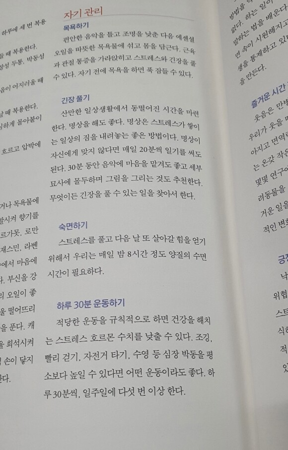 먼지 규칙적인 운동습관, 면연력을 키우는법, 스트레스를 극복하는 법 자기관리를 위해서 긴장풀기(명상을 하면 좋은거 같다), 숙면하기, 하루30분 운동하기, 긍정적으로 생각하기등이 있다