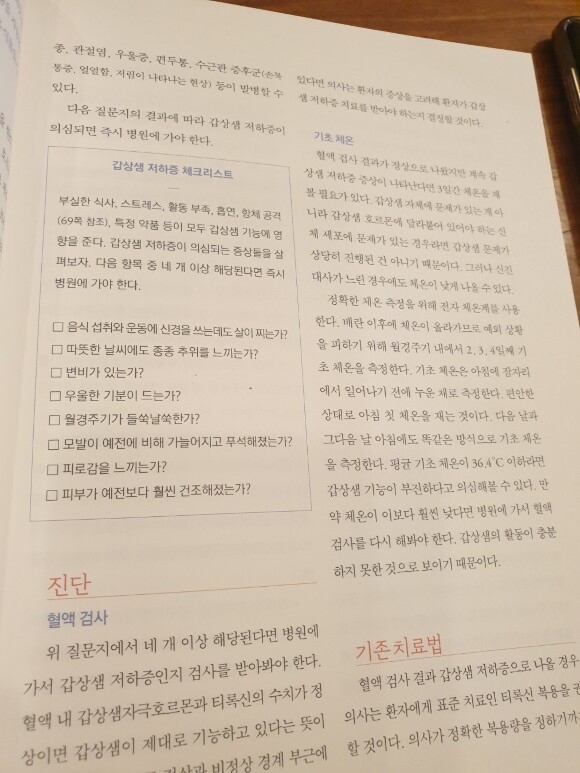시어머니께서 갑상선 저하증이라고 하셔서..좀 유심히 읽었어요. 진단테스트도 있어서 가볍게 진단해보고 의심이 되면 병원에 가는편이 좋을꺼 같아요. 병에 대한 내용도 상세히 적혀 있어 정말 공부가 쏙쏙 되네요~ 얼마전 난소낭종으로 복강경수술을 받았는데... 참.. 지식없이 수술을 받았구나 하는 반성을 했네요. 이 책에 난소 낭종에 대해 자세한 설명과 치료법 예방법 그리고 수술을 했다면 추후 어떻게 해야하는지도 나와있네요.