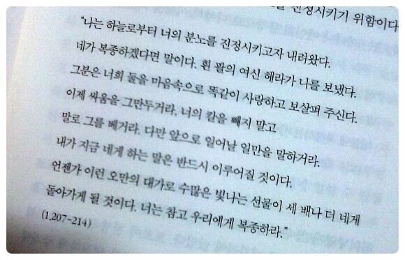 “분노는 떨어지는 꿀보다 훨씬 달콤해서 인간들의 가슴속에 연기처럼 퍼져 버려요. 인간들의 왕 아가멤논은 나를 분노하게 만들었어요.”