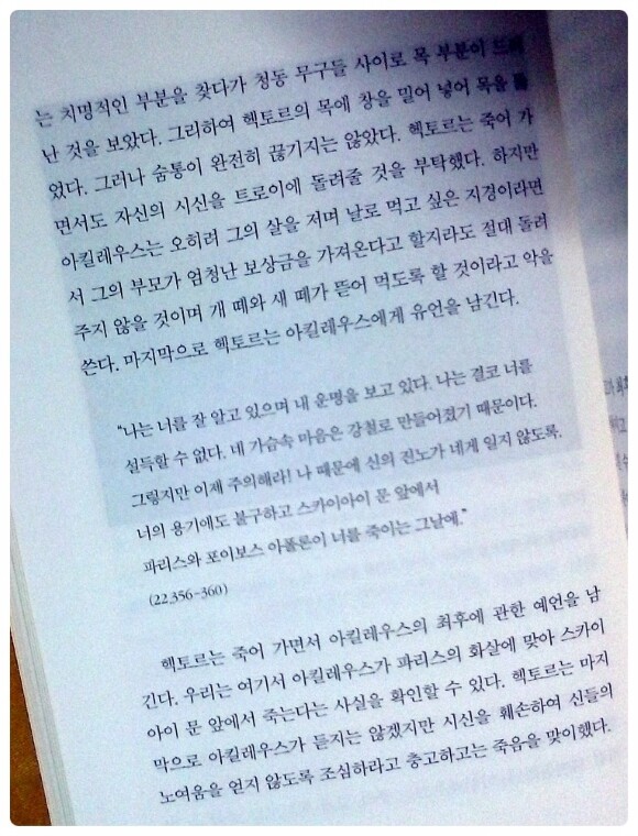 위 내용은 책의 맺음말의 시작부분이다. '일리아스'를 관통하는 저 이야기가 책을 덮을 즈음에는 쉽게 읽혔다. 지은이는 반복해서 '일리아스' 이야기의 정체성에 대해 이야기한다. '일리아스'의 시작이 왜 트로이 전쟁의 시작이 아닌지, 그리고 끝이 왜 트로이 전쟁의 끝이 아닌지를 말이다. 사건이 아니라 인물에 중심을 둔 고대서사시의 특징이 드러나는 부분이다. 우리는 모두가 '아킬레우스'가 트로이 전쟁이 끝나기 전에 죽었다는 것을 알고 있지만 '일리아스' 안에서 '아킬레우스'는 그저 불멸의 영웅일 뿐이다. 반신인 그는 모든 인간들을 뛰어 넘는 능력을 가진, 그 존재만으로도 아군의 사기를 진작시키고, 적군에게는 공포감을 주는 그런 존재. '일리아스' 속에서 '아킬레우스'는 결코 죽지 않는다.