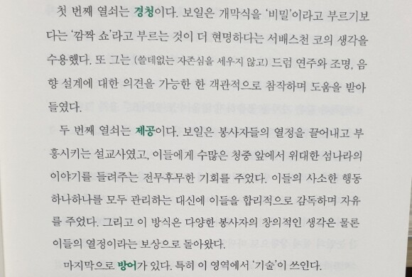 각종 편법과 불공정이 난무하는 세상에서 품격을 지키며 정정당당하게 경쟁에 임하기는 쉽지가 않다. 착하고 정직하면 바보라는 소리를 듣는 세상인데 이 책은 무례한 세상에서 품격을 지키며 이기는 기술을 가르쳐준다고 하니 과연 그게 현실적으로 가능할까 싶었다. 2012년 런던 올림픽 개막식을 준비하던 영화감독 대니 보일이 개막식의 비밀유지를 위해 썼던 방법을 시작으로 성공의 품격을 결정하는 3가지 원칙을 알려준다.