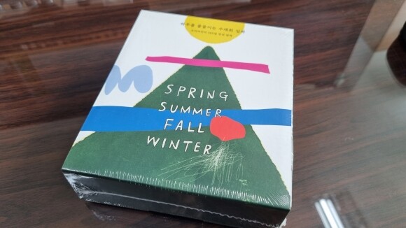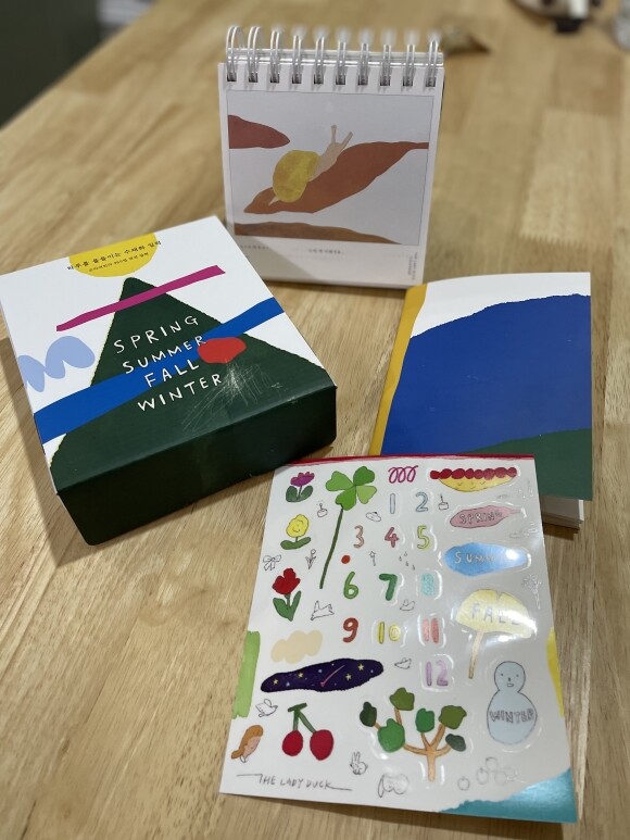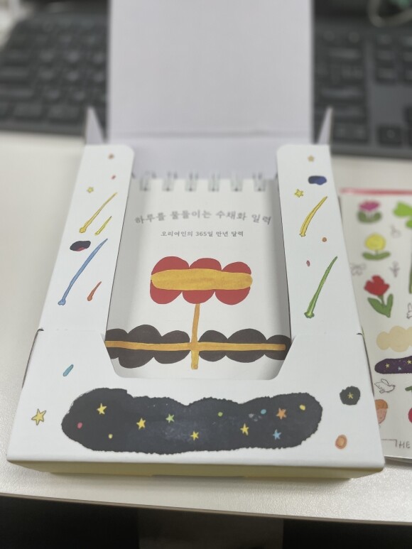 받자마자 급하게 찍고, 포장을 열어서 보는데 패키지 부터 너무 예쁩니다. 상자 안에 달력만 있는게 아니고, 얇은 먼슬리 다이어리와 예쁜 스티커까지 있어서 보너스 받은 느낌이에요. 한 장 한 장 넘기는데 365장을 모두 다른 그림으로 그리신 작가님의 노고가 느껴졌구요.