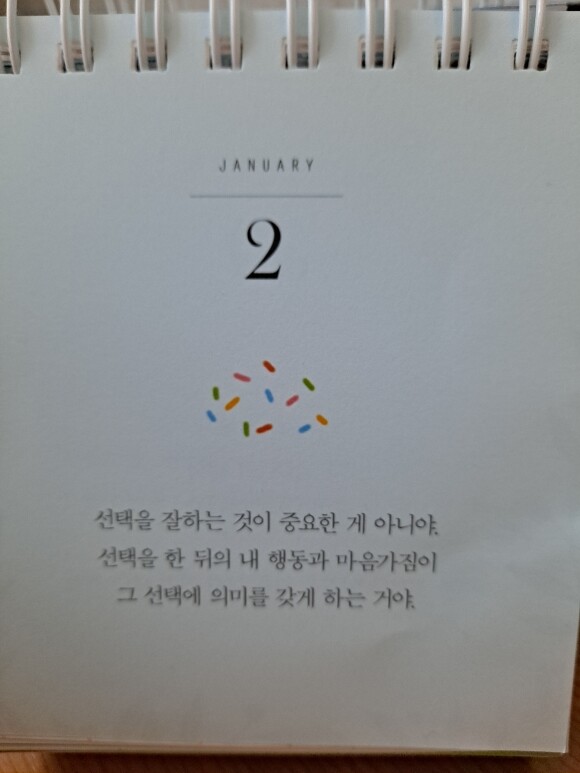 아끼는 동생에게 새해 선물로 주려고 준비해봤어요. 일러스트도 좋고, 메시지도 좋아서 마음에 들어요. 책상 위에 올려놓고 매일매일 새로운 문구 보며 힘냈으면 좋겠습니다. 동생도 받고 너무 좋아해주니 뿌듯하네요. 매일 책을 읽기 어려운 분들도 하루에 한 구절씩 읽을 수 있어서 참 좋은 일력인 것 같습니다.