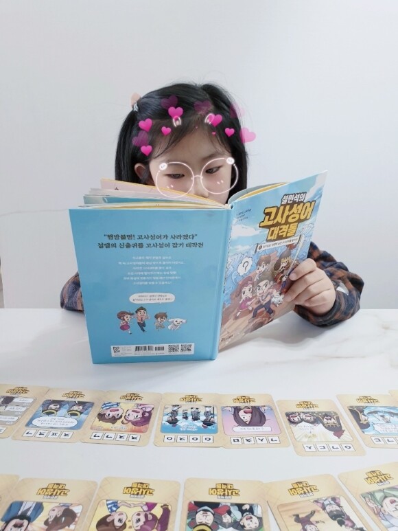 아이가 설민석 작가님 책을 애정하고, 애장합니다.^^ <설민석의 한국사 대모험>, <설민석의 세계사 대모험> 시리즈를 모두 소장하고 있어요. 신간 검색을 하다 우연히 고사성어 대격돌을 발견하고 바로 구매했는데요, 아이가 책을 너무 좋아하네요. 워낙 책 읽는 것을 좋아하는 9세 여아라 다른 속담책이랑 고사성어책들을 많이 읽었는데, 설민석의 고사성어 대격돌을 읽고 나서 이렇게 이야기를 하더라고요~ 그 전에 고사성어 책들은 대부분 하나의 고사성어를 2쪽 정도로 설명해 주거나 해서 읽을 때는 재미있었는데 다 읽고 나서 특별히 기억에 남는 고사성어는 없었다고요.. 근데 이번 설민석 고사성어 대격돌은 책을 다 읽고 난 다음에도 고사성어들이 생각난다고 하더라고요~ 그래서 저랑 5학년 언니도 읽어 보았어요~ 확실히 이야기 속에 고사성어가 자연스럽게 녹아 있어서인지 재미있게 읽히는데다 스토리가 생각이 나니 고사성어가 (완벽하게는 아니어도) 기억이 난다고 아이들이 입을 모으네요~ 부속 페이지에 퀴즈들도 재미있더라고요~ 동생이 주1회 학교 가는 언니가 숙제를 몰아서 하니, "자업자득"이라고 하고, 언니는 마스크 써서 감기도 안 걸리고 코로나도 예방한다고 "일거양득"이라고, 둘이 막 그럽니다~>_<! 서로 카드로 초성게임도 하고요~ 자꾸 언니가 "감언이설" 한다고 그러고..(뭘로 꾀었길래...ㅎㅎ) 리뷰글은 거의 안 쓰는데 효과가 좋아서 한번 써 보았습니다~ 정말 믿고 보는 설쌤이네요~!