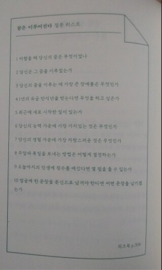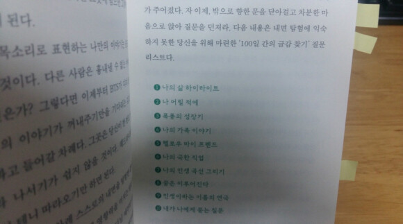 10개의 주제로 구성된 질문 리스트, 각 주제당 관련 질문은 10개로 해서 질문 리스트에 답하며 그날그날의 주제로 글쓰기를 하는 것을 권장한다. 각 주제 끝 부분에 질문 리스트가 적혀 있기 때문에 쉽게 따라하면서 글을 쓸 수 있었다.