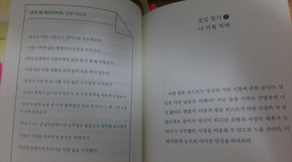 소설처럼 만들어지는 글은 어려울 수 있지만 자신의 이야기를 자연스럽게 풀어내는 것으로 시작해보면 어렵지 않게 글을 끌어낼 수 있다. 저자가 적어준 목차대로 기억을 끄집어내보자.