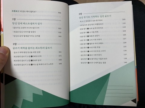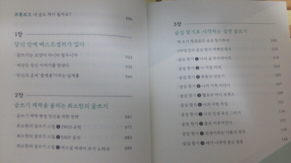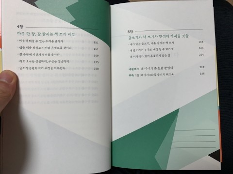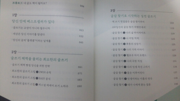 책의 목차를 보면, 책의 흐름, 컨셉, 내용을 알 수가 있다. 글쓰기를 해야하는 당위성 / 글쓰기 스킬 / 실전 글쓰기를 위한 글감 찾기 / 책 쓰기 비법 / 글쓰기와 책쓰기를 통한 인생 이렇게 소개가 되어있다.
