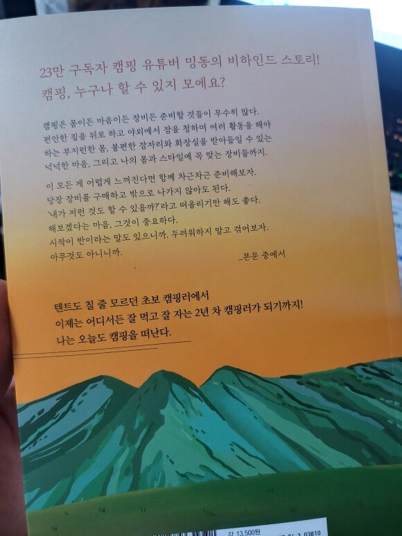 소소하게 캠핑을 즐기는 캠린이인데 밍동님 유튜브 보면서 캠핑에 더 빠지게 됐어요. 이제 백패킹까지 가고싶어지고 강아지 입양욕구까지 폭팔 이지만....ㅋㅋㅋㅋ그건 참고 눈으로 힐링하고 있네요! 요즘 일상이 밍동님 유튜브 보는건데 책을 내셨다하여 호다닥 주문했네요! 배송도 하루만에 온거같아요 칼배송!!! 얼른 잘 읽어보겠습니다:) 틴케이스가 찌그러져서 왔어요 제 심장도 찌그러지는기분.. |