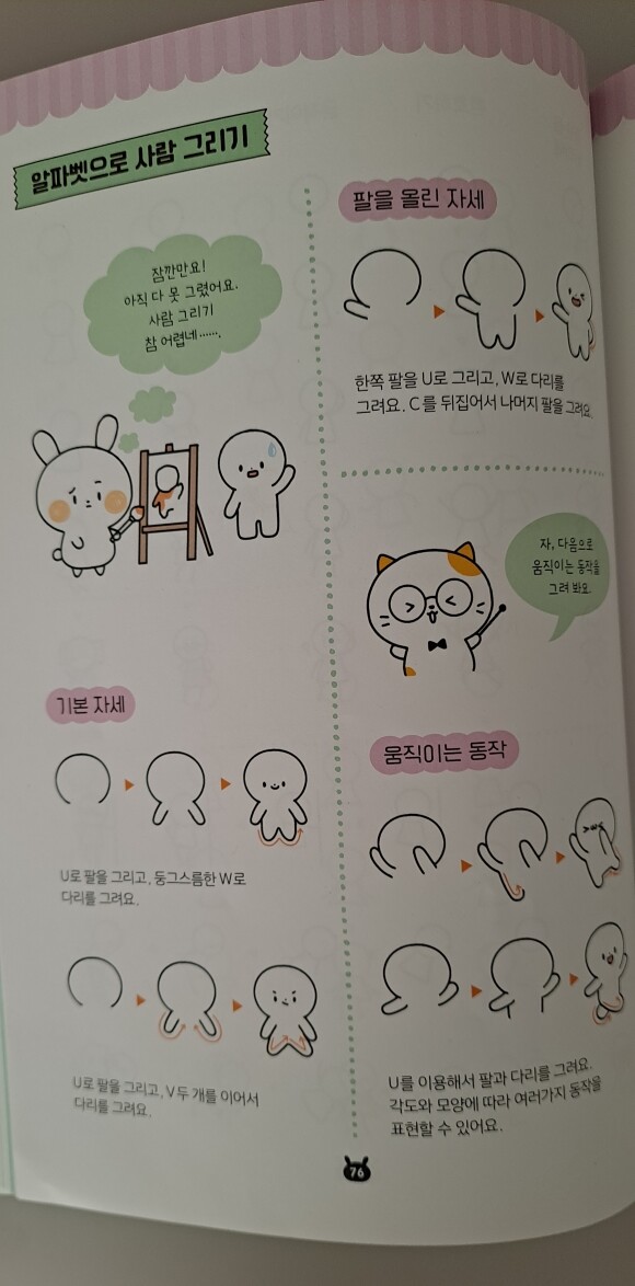 취미든 부업이든 요즘 부쩍 그림을 그리는 사람이 많아진 것 같다. 나도 어릴때 이런 비슷한 그림 책을 따라 그렸던 기억이 난다. 표지부터 귀염 귀염한 그림들이 가득해서 따라 그리고 싶은 마음이 강하게 든다. 움직이는 그림을 그리는게 어려웠는데 간단한 동작들도 있어서 따라 그리면 그림 실력도 늘 것 같다. 나보다 오히려 아이들이 더 좋아하며 책 받자마자 따라 그린다. 귀여운 동물부터 얼굴 표정, 실생활 도구까지 다양하다. 초보자들도 따라그리기 쉽게 단순하지만 그림이 귀엽다. 누구든 따라 그리면서 기본적인 그림툴을 익히면 자기만의 그림 스타일도 가질 수 있을 것 같다.