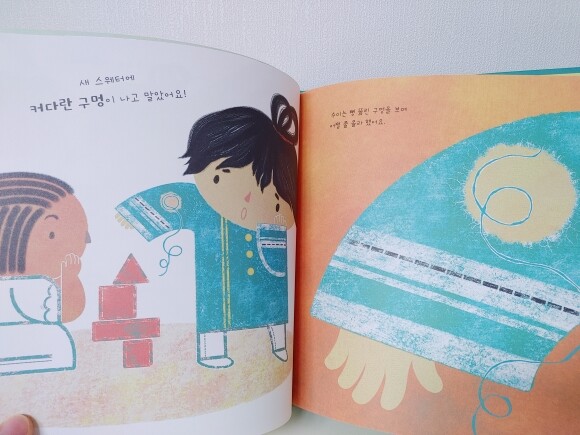 친구들이 수미의 구멍난 스웨터를 위해 여러가지 도움을 주지만 그럴수록 스웨터는 더욱더 너덜너덜 해졌어요. 새옷이 망가져서 속상한 수미와 그걸 보고 아무렇지 않은듯 아이를 위로해주고 해결해주는 모습에서 따뜻한 엄마의 마음을 느낄 수가 있었어요.