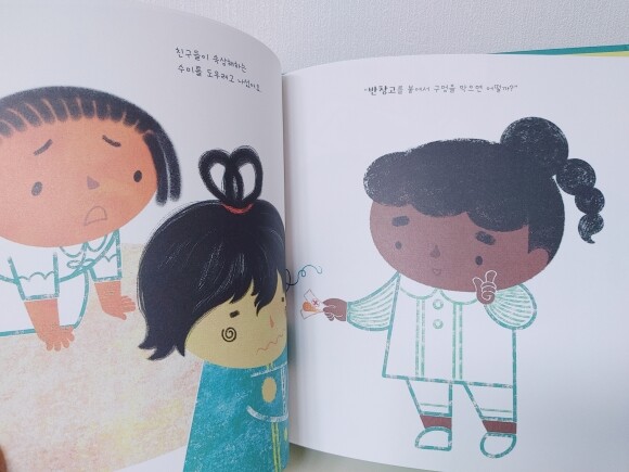 구멍이 나는 바람에 속상해하는 수미의 이야기인데요, 중간중간, 아이들이 익혀야 하는 개수 개념이나 위, 아래 등 같이 배울 수 있어서 좋았어요.