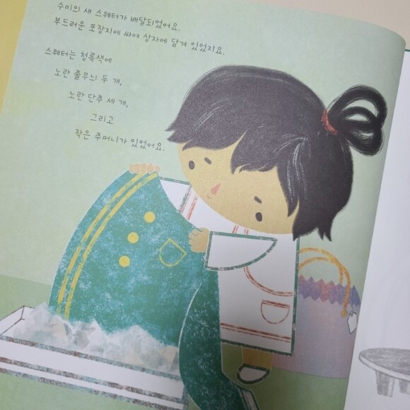스웨터에는 청록색에 노란 줄무늬 두 개, 노란 단추 두 개 그리고 작은 주머니가 한 개 있었죠, (이 부분에서 딸이랑도 단추가 몇 개? 이러면서 물어보면서 읽었어요^^)