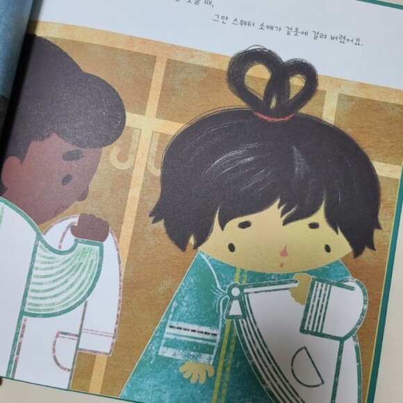 수미의 새 스웨터가 배달되었어요. 부드러운 포장지에 싸여 상자에 담겨있었지요 ^^ 로 시작하는 마음 따뜻해지는 책이에요 ^^ 스웨터는 청록색에 노란 줄무늬 두개, 노란단추 세개, 그리고 작은 주머니가 있었어요. 글만 읽어도 예쁜 스웨터가 상상이 되는 ~ ^^ 수미는 스웨터를 얼른 입고 싶었을 것 같아요. 길이도 크고 팔길이도 길어서 좀더 키가 큰 다음에 입어야할텐데... ... 눈앞에 예쁜 스웨터를 빨리 입고 싶었을꺼에요 ~ 우리 아이들도 그래요. 철마다 옷사러 가면 딱 맞는 사이즈보다는 좀 넉넉한 옷들을 사입히게 되거든요~ 쑥쑥 자라는 아이들이다보니 ~ 아무래도 사이즈 넉넉하게 사는 편인데 아이들은 사오는 날 바로 입고 싶어하지요. 빨리 입고 유치원에 가고싶을테니까요. 수미의 마음도 그랬을꺼라고 아이들이 얘기하네요. 수미의 마음이 뭔지 '알것같다구요 ^^ 수미 역시 ^^ 스웨터를 입고 등원하나봐요~ 친구들에게 보여줄 생각에 신났을 수미, 그런데 겉옷을 벗을때 그만 스웨터 소매가 걸렸네요. 소매에서 실이 조금 풀리더니.... 계속... 술술 풀려나왔어요. 그러다 그만 구멍이.... 속상해하는 수미를 위해 친구들은 반창고를 붙여주고, 풀도 발라보고, 테이프도 붙여봐요. "괜찮아, 구멍은 다시 예쁘게 메울 수 있단다."