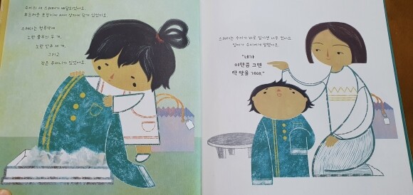 새옷을 샀을 때 느끼는 아이의 설레는 감정을 그대로 표현하고 수미를 위해 도와주는 친구들의 모습과 실수를 어떻게 대처해야하는지 보여주는 엄마의 행동을 통해 오히려 제가 배우고 깨닫게 되는 그림책이었던거 같아요. 어릴적 새 옷을 사서 입었을때 그 감정과 김치국물이라도 묻었을때 속상했던 그 감정이 갑자기 생각났거든요. 아이의 실수를 따뜻하게 이해하고 도와줄수있는 엄마가 되어야겠다고 느꼈답니다.