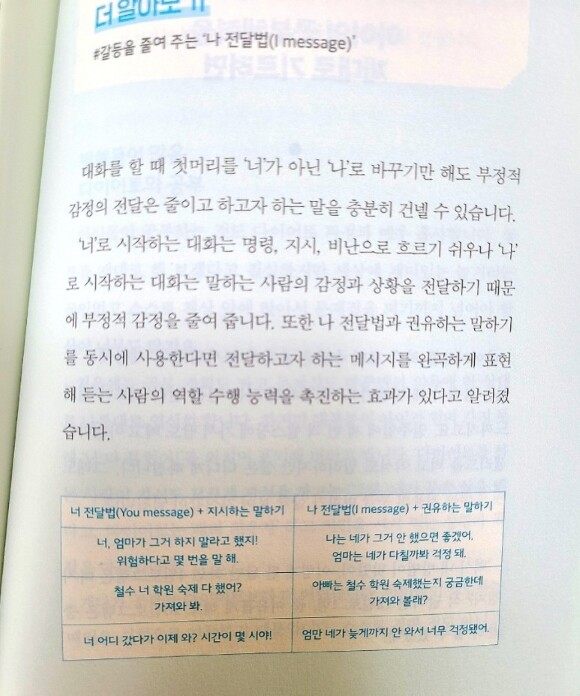 우등생을 키우는 부모의 자세에서 mbti유형검사 이야기가 나와요. T(사고)형과 F(감정)형은 서로가 서로를 이해하는데 어려움을 겪는다고 해요. 서로의 기질특징을 모르는 상황이라면 대화가 서운하게 느껴질 수 있으니 서로 mbti검사를 해서 아이와 부모의 공통점과 차이점을 발견해 나가며 서로 감정적으로 상하지 않고 올바른 미래를 그려나가도록 이야기하고 있는 점이 마음에 들더라고요.