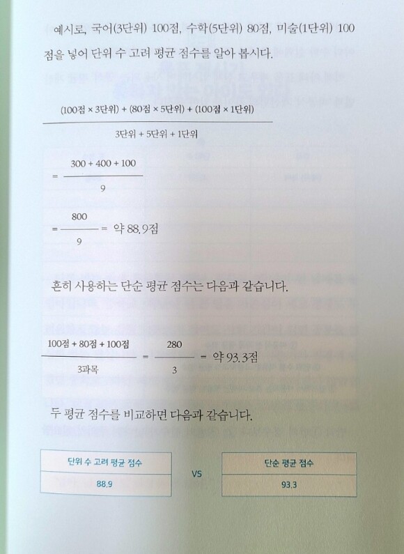 책에서 평균이라는 말의 함정에 대해 설명해놓았는데요 학원의 광고에 의해 나오게 된 평균... 물론 학원에서는 음악, 미술, 체육은 가르치지 않고 대부분 국, 영, 수, 과, 사 과목만 있죠 하지만 고등학교에 가서는 일주일에 그 수업이 몇 번 들었는지 단위수를 고려해서 성적을 계산해야 한다고 합니다 단순히 점수로만은 평가할 수 없다는 거죠