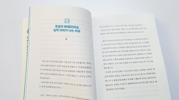 똑같이 90점이어도 실력 차이가 나는 이유 공부법을 소개하는 책이나 유일한 비법이 담긴 책이라도 모든 내용이 정답은 아닙니다. 아이들이 가진 역량과 공부환경, 공부습관에 따라 성취도가 다르고 수학이나 영어 부분에서는 다른 공부법 책에서와 비슷한 논리도 있습니다.그럼에도 차별화되는 점은 아이가 받아온 평균 점수에 현혹되어 잘하고 있다는 착각을 빨리 깨달아야 한다는 주장이 굉장히 설득적이었다는 것입니다. 저역시 어떤 문제를 틀렸는지 보기도 전에 90점이라는 점수만 보면 잘하고 있구나~라고 생각했던 터라 아이를 객관적으로 파악하는 것은 물론 평균 점수만 신경을 썼는데 좀 더 객관적으로 파악하는 것이 먼저라는 생각이 들었습니다.