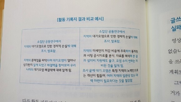 위의 사례에서 어떤 학생이 더 우수하다고 평가할 수 있을까요? 일반인인 제가 봐도 오른쪽 학생에게 우수한 점수를 줄 것으로 생각됩니다. 왼쪽은 결과를 노출하기 위한 구체적인 사례조사가 빠져있습니다. 이것은 마치 말안해도 다 알죠? 라는 뉘앙스가 풍기는 기록지라는 점은 쉽게 알 수가 있습니다. 열심히 과제 수행을 하고도 활동 기록지의 내용이 부실하다는 이유로 평가를 제대로 받지 못한다면 그것만큼 억울한게 있을까요? 그리고 각 장이 끝나면 더 알아보기로 사례중심의 내용들이 실려있습니다.