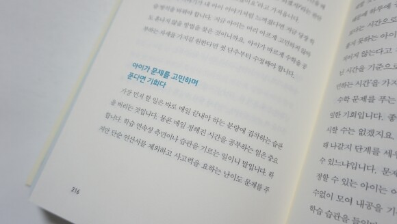 아이 유형에 따라 수학 공부 접근 방법이 잘 나와있고, 문제집의 동그라미 개수에 집착하지 말고, 수학적 사고력을 기르는데 집중 투자해야 수포자가 되는 길을 피할 수 있어요. 또한, 매일 끝내야 하는 분량에 집착하는 습관을 버리고 시간을 기준으로 학습하는 연습으로 고민하는 시간이 사고력을 높이는 유일한 기회라고 하네요.