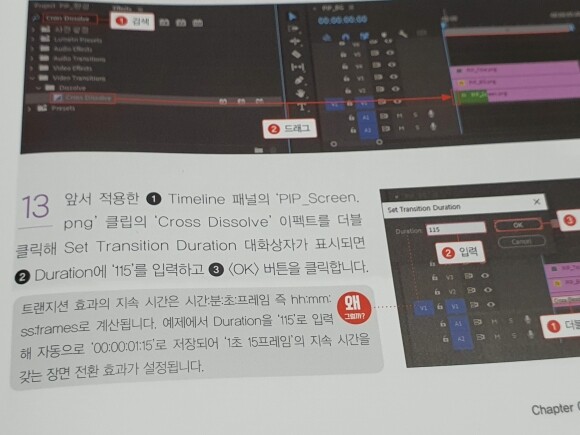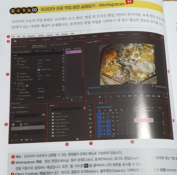 책 내용을 살펴보면 IT도서 그 중에서도 기능이 다양하여 입문자에게 UI가 익숙하지 않은 프리미어 프로의 구동 전체 화면과 함께 부분 설명에서는 해당하는 이미지를 확대하여 내 PC 화면과 맞춰 가면서 익히기 편하도록 캡쳐 이미지가 많이 첨부되어 있다.