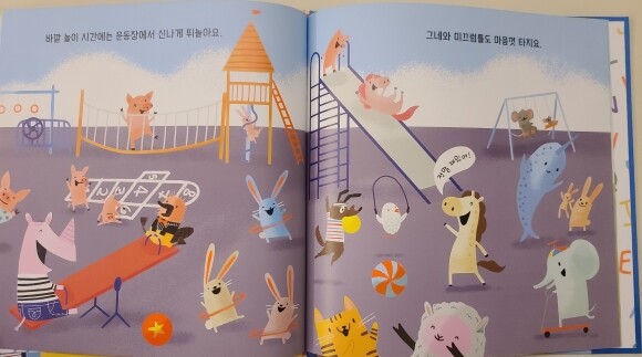아이가 좋아하는 여러 동물 친구들이 한가득 나와 더 집중하며 재미있게 볼 수 있었어요. 몇 주 동안은 하원 후에도 계속 알림장 사진들을 보여주며 어린이집 이야기를 자꾸 꺼내서 어린이집이 즐겁고 신나는 거란 걸 알려주었는데요. 이렇게 책으로 보여주니 아이도 더 좋아하고 재밌어하더라고요. 어린이집과 유치원 적응을 어려워하는 아이들에게 읽어 줄