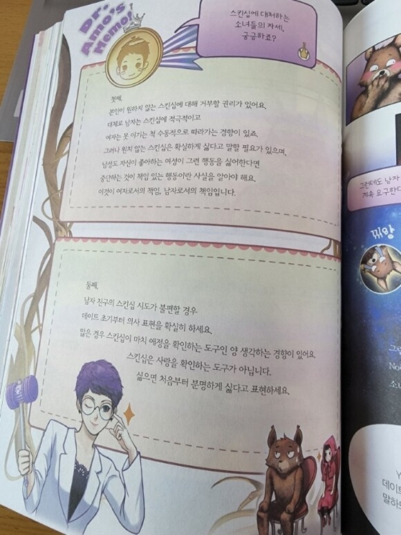 스킨십에 대처하는 소녀들의 자세.. 전 개인적으로 이부분이 좋았어요 딸아이가 크면서 저도 서점에서 사춘기책 몇권을 접했었는데 피임에 대해서 설명을 하며 제일 먼저 콘돔이 무엇인지 그리고 콘돔이 왜 필요한지 콘돔을 어떻게 사용하는지등을 설명하는데.. 사실 정말 알아야하고 중요한 내용이긴 하지만 콘돔보다 더 먼저인것이 이런 스킨십에 대처하는것 아닐까요? 스킨십을 거부할 권리가 있고, 상대방에게 확실하게 싫다고 말해도 괜찮다는걸 먼저 알려주는게 제일 중요한 부분 같아요