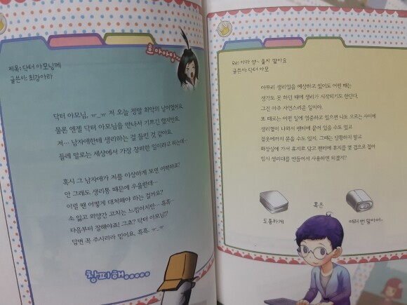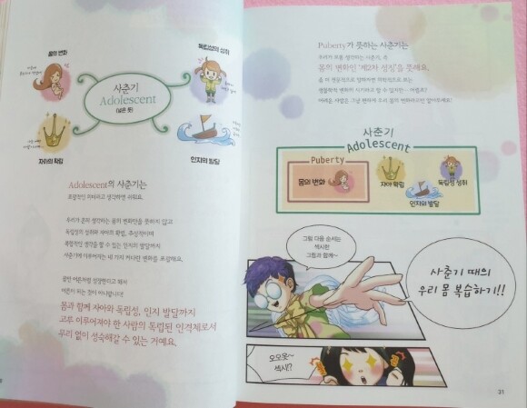 요즘은 환경호르몬으로 인해 2차 성징이 빨리 와서 엄마들 걱정이 많은거같아요 생리대 고르는 법과 뒷처리법 쾌적한 생리를 위한 습관 등도 만화로 잘 알려주니 거부감없이 하나둘 알아갈 수 있어 좋아요 또한 이성교제에 관심보일 수 있는 나이이기에 이성교제시 알아야하는 것들 스킨십을 원하지 않을때는 싫다고 의사 표현을 확실히 해야함을! 성추행범들을 대처하는 방법들도 잘 나와있어요