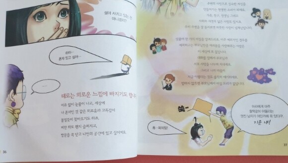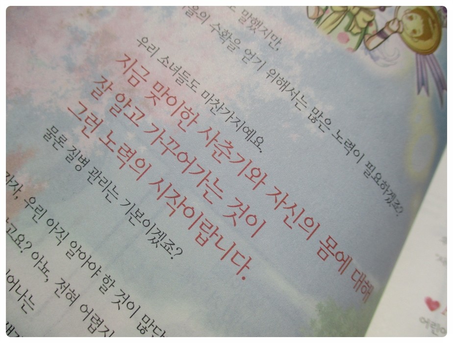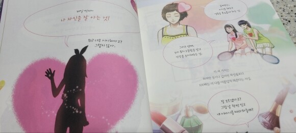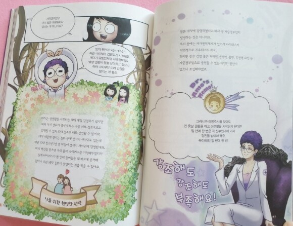 사실 다양한 여자들의 아름다움을 꼭 집어 이야기 할수는 없지만 아름답게 가꾸기 위해 꼭 알아야 할 것들이 있다는것!! 이 책에서는 나를 아름답게 가꾸어주는 것들에 대해서 말해주고 있어요 사실 성교육책이라하면 너무 유아틱하거나 아니면 너무 적나라해서 선택하는게 쉽지 않았는데^^;;; 이 책은 웹툰 주인공같은 아라를 중심으로 사춘기 소녀의 일상을 보여주어서 더 친숙하고 재밌게 읽을수 있었어요
