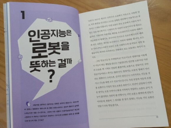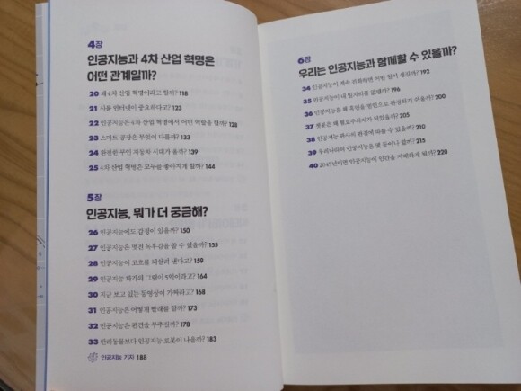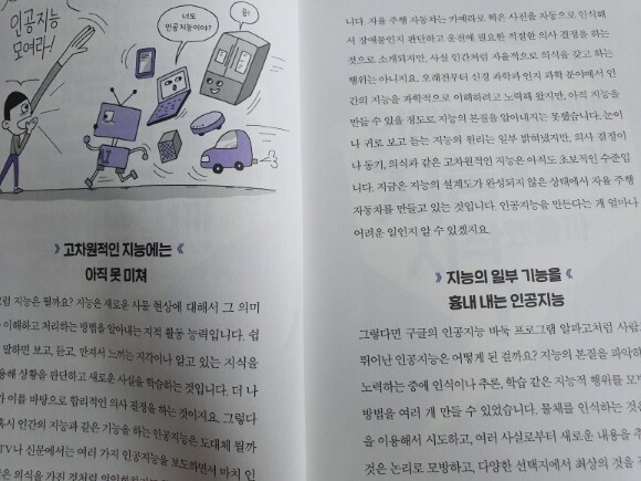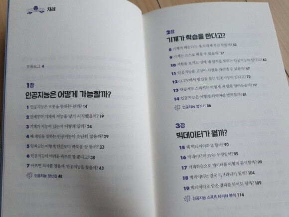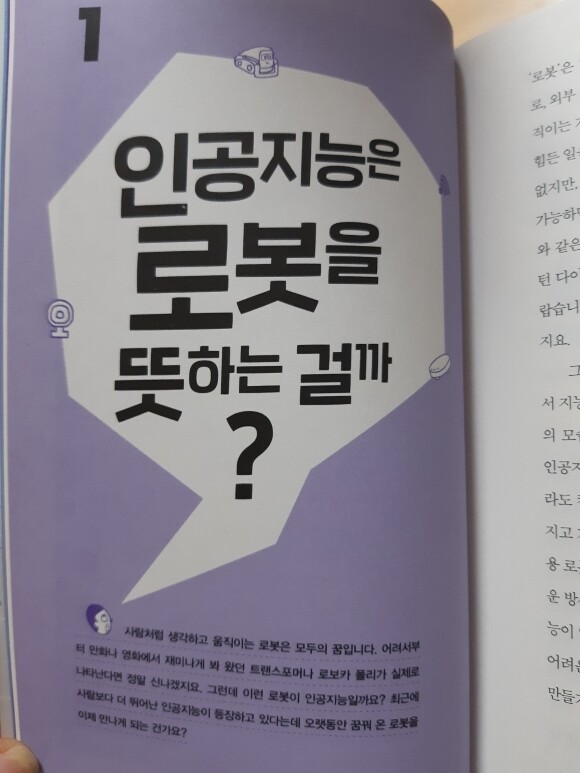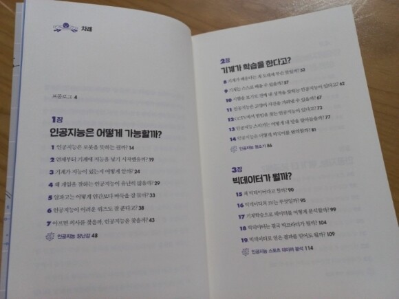 요즘 우리는 수많은 기계에 둘러쌓여 살고 있는것 같다. 스마트폰은 기본으로 모두들 갖고 있고, 우리가 사용하는 기기들이 점점 많아지는 요즘이다 더 그렇게 느낀것이 최근 몇년간 우리집에 많은 기계들이 들어와서 잘 사용하는것도 있었고, 코로나로 인해서 더 많은 기기들을 사용하면서 느끼는것같다. 우리는 인공지능과 함께 할 수 있을까? 이 책은 지금 현재 우리주변에 있는 인공지능들에 대해서 설명을 해주고 있다. 아이들이 읽어보기에는 어렵지않게 그림과 함께 설명을 하고 있어서 아이도 읽으면서 관심있게 집중해서 읽기 시작했다. 차례를 보니 우리가 최근들어 많이 들어본 단어들이 눈에 띄었다. 인공지능 / 빅데이터 / 4차산업혁명등 최근들어서 많이 들어보고, 느낀 단어들이 많이 있었다 과연 이러한 인공지능과 함게 우리들은 잘 지낼 수 있을까???