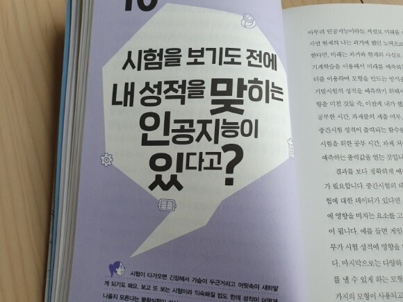 우리는 인공지능과 함께 할 수 있을까? 우리 아이들이 살아갈 미래는 인공지능 시대가 될 거라고 해요. 지금도 많은 부분에서 인공지능과 빅데이터를 활용하고 있기에 책을 읽고 인공지능이 무엇인지 알아보고 준비해 볼 수 있는 시간을 가질 수 있을 거 같네요. 책 속에는 인공지능에 대해 궁금해하는 40가지의 질문을 주제로 그에 대한 답을 찾아 알려주고 있어 인공지능을 이해하는 데 도움이 되었어요. 인공지능의 정의, 기계학습(머신러닝), 빅데이터, 인공지능과 4차 산업혁명, 인공지능의 현재와 미래에 대해 알아보고 인공지능 스피커, 인공지능 로봇, 인공지능 청소기 등 우리 생활과 관련된 인공지능에 대해서도 살펴볼 수 있었답니다. 책을 읽으며 앞으로 우리 생활을 함께 할 인공지능에 대해 이야기 나누는 시간을 가져보세요^^