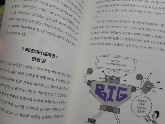 질문에 대한것도 요즘 많이 보는 주제도 있어서 더 관심이 가는 부분이 있었다. 요즘 뉴스나 매체에서 빅데이터 분석을 해서 발표하고, 빅데이터 전문가들도 많이 나오는데 그 데이터 분석에 대해서 다 믿어야할까?? 예측가능한걸까?? 궁금증도 생기고, 그에 대해서 알려주는 부분도 있어서 아이들이 더 생각하는 시간도 가질 수 있겠다.