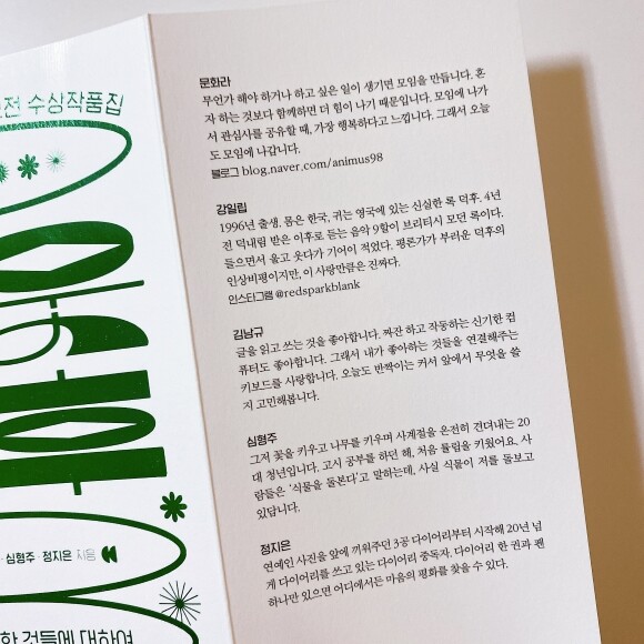 이 책은 제1회 미래엔 단편 에세이 공모전 수상작품집 《이웃덕후 1호》이다.