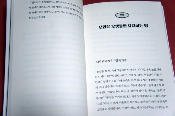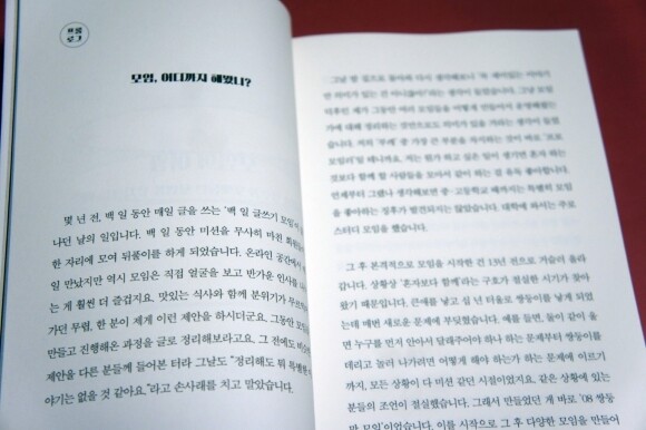 또한 모임 유지 비법도 하나하나 공감이 간다. 그중 먼저 마음 자세부터 인상적이다. 오래 가려면 꼭 필요한 자세라는 생각이 든다. 20여 개 이상의 모임을 운영하면서 지금까지 유지가 가능했던 이유는 아마도 감정 소모가 심하지 않았기 때문인 것 같습니다. 인생에 좋은 날도 있고 힘든 날도 있듯이, 이런 사람도 있고, 저런 사람도 있구나 하고 생각하는 편입니다. 만약 모임을 계속 유지해나가기 위해서 어떤 마음의 자세가 필요하냐고 제게 묻는다면 '너무 뜨겁거나 혹은 차갑지 않아야 한다'고 답하고 싶습니다. (31쪽)