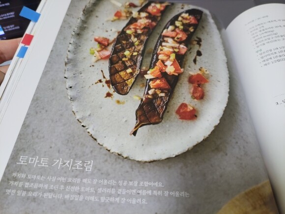 무엇보다 건강이 제일 중요하고 건강에는 무엇을 먹느냐가 중요하죠. 채소를 많이 먹어야 좋다고 하지만 일부러 챙겨먹지 않으면 또 잘 안먹게 되고요. <홀그레인 채소 요리>는 익숙하지는 않지만 예쁘고 건강도 챙길 수 있는 요리들이 가득 들어있네요. 흔한 채소 요리에서 벗어나 통곡물과 슈퍼푸드, 견과류, 씨앗류, 콩류를 다양하게 활용한 점이 매력있어요. 채식하면 떠올리기 쉬운 샐러드 뿐만 아니라 수프와 스튜, 핑거푸드, 밥/면/빵, 일품 요리에 음료와 사이드디시까지 푸짐하게 들어있어요. 개인적으로 저는 홀그레인이나 견과류, 씨앗류와는 별로 친하지 않지만 이번 기회에 친해져봐도 좋을 것 같네요. 아니면 굳이 레시피에 나와 있는 재료가 아니라 평소 먹는 식재료를 먼저 활용해봐도 좋을 것 같아요. 아직 많은 요리를 만들어보지는 않았지만 제일 먼저 만들어본 토마토 가지조림은 정말 맛있었어요! 모양도 좋고 채소를 진짜 푸짐하게 먹을 수 있었답니다.