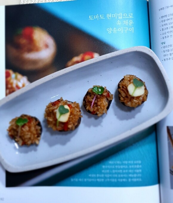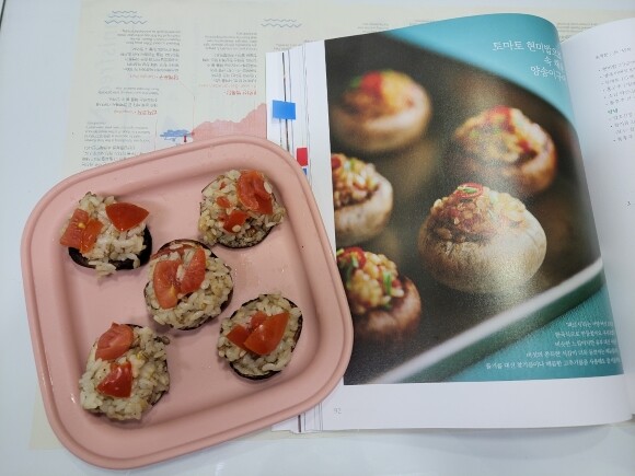 토마토 현미밥으로 속 채운 양송이구이는 맛도 좋아 가족들의 인기를 얻었답니다