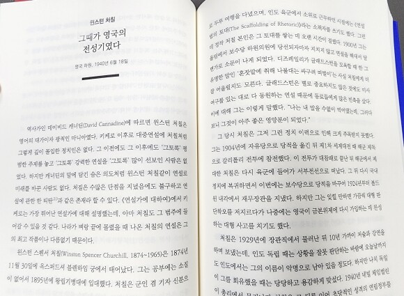 신뢰를 잃어가고 있는 정치판과 슬로건과 욕설이 지배적인 소셜 미디어와 가짜 뉴스가 판치는 현실에서 정치에 대한 환멸과 냉소는 위험한 환상을 조장할 수 있다. 그래서 정치에 무관심했음을 반성하며 유심히 읽어 나가긴 했지만, 개인적으로는 읽는 데 시간이 많이 걸려서 다소 힘들었다. 그래도 위대한 연설문뿐만 아니라 정치가들이 어떤 성장배경을 가지고 어떤 삶을 살았는지도 알 수 있어